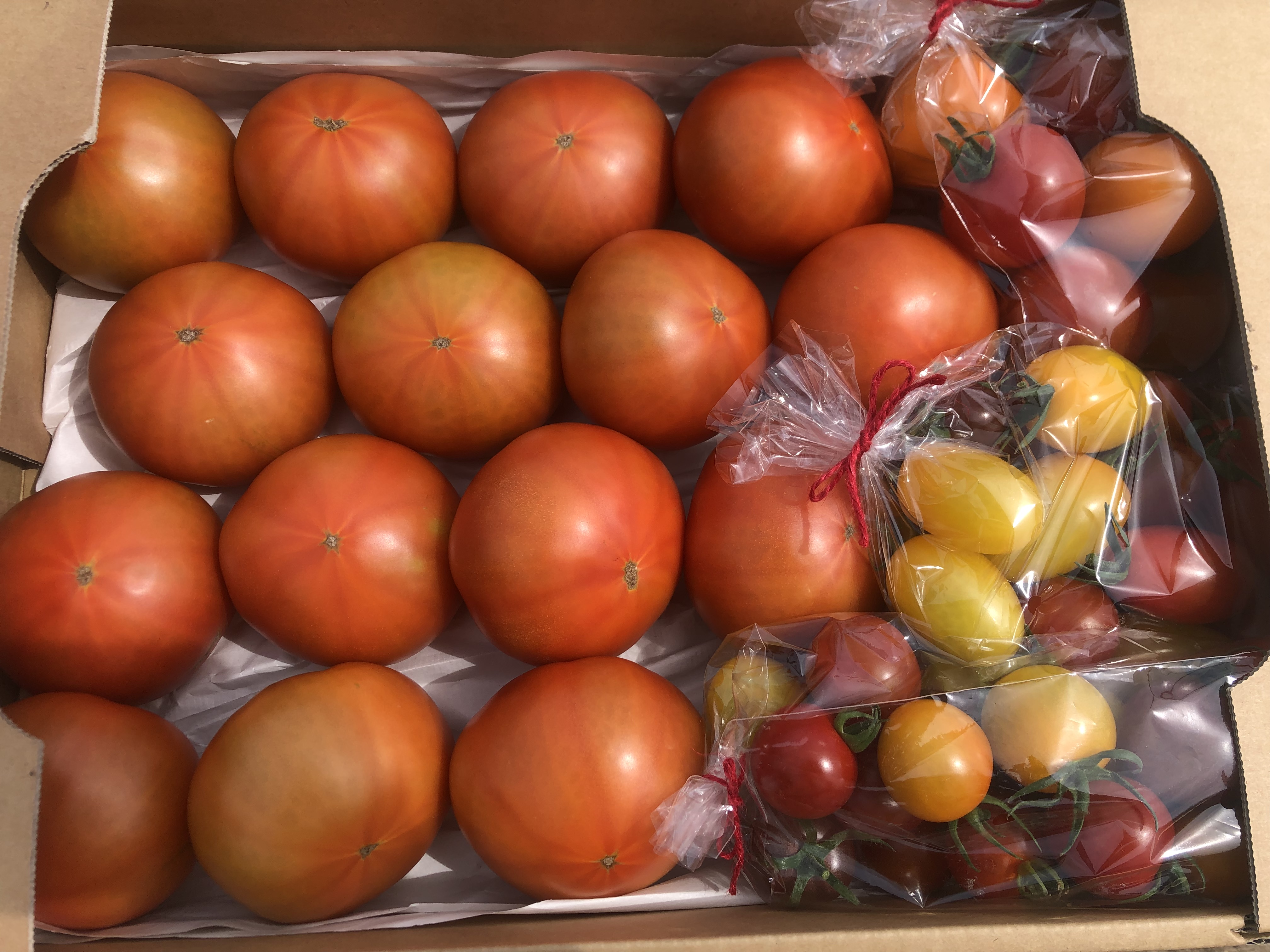 大玉トマト、ミディトマト、ミニトマトの3種類がセットになりました。ミディトマト、ミニトマトは季節により色や形がバラエティに富んだものが入ります。